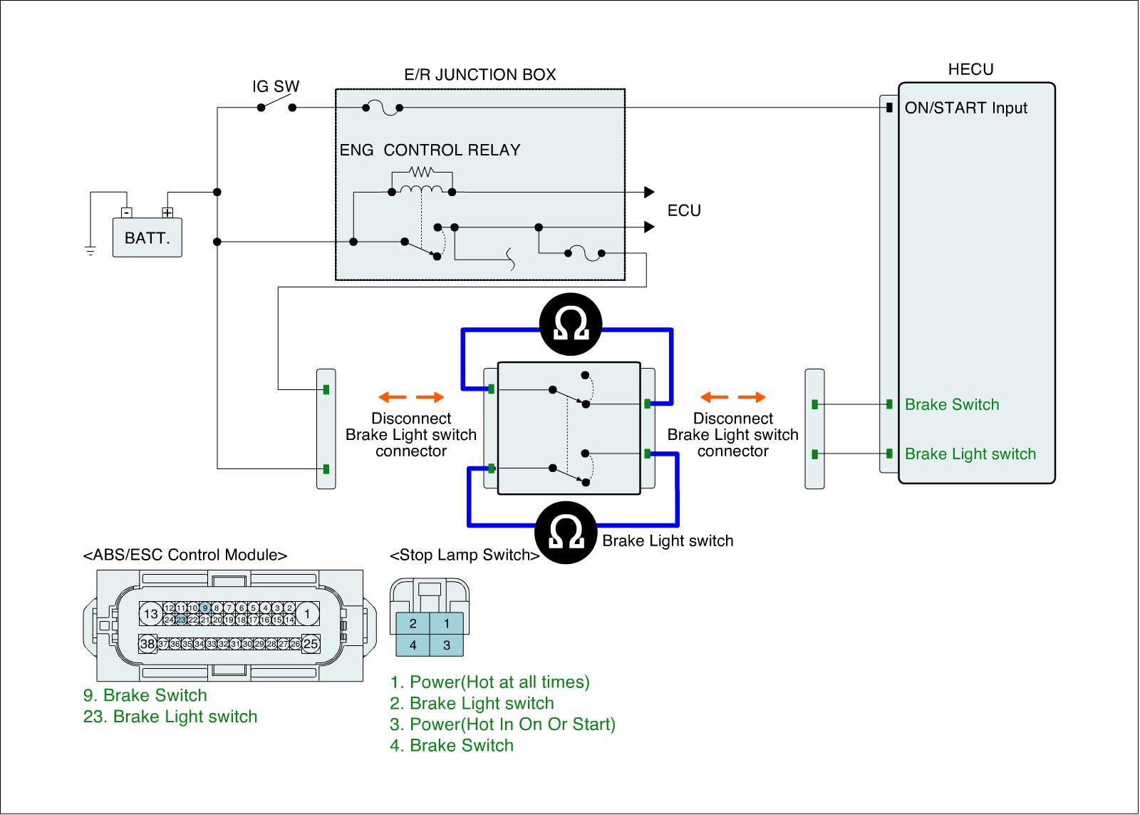 3. Measure resistance between power terminal and siganl terminal of the brake light switch connector.