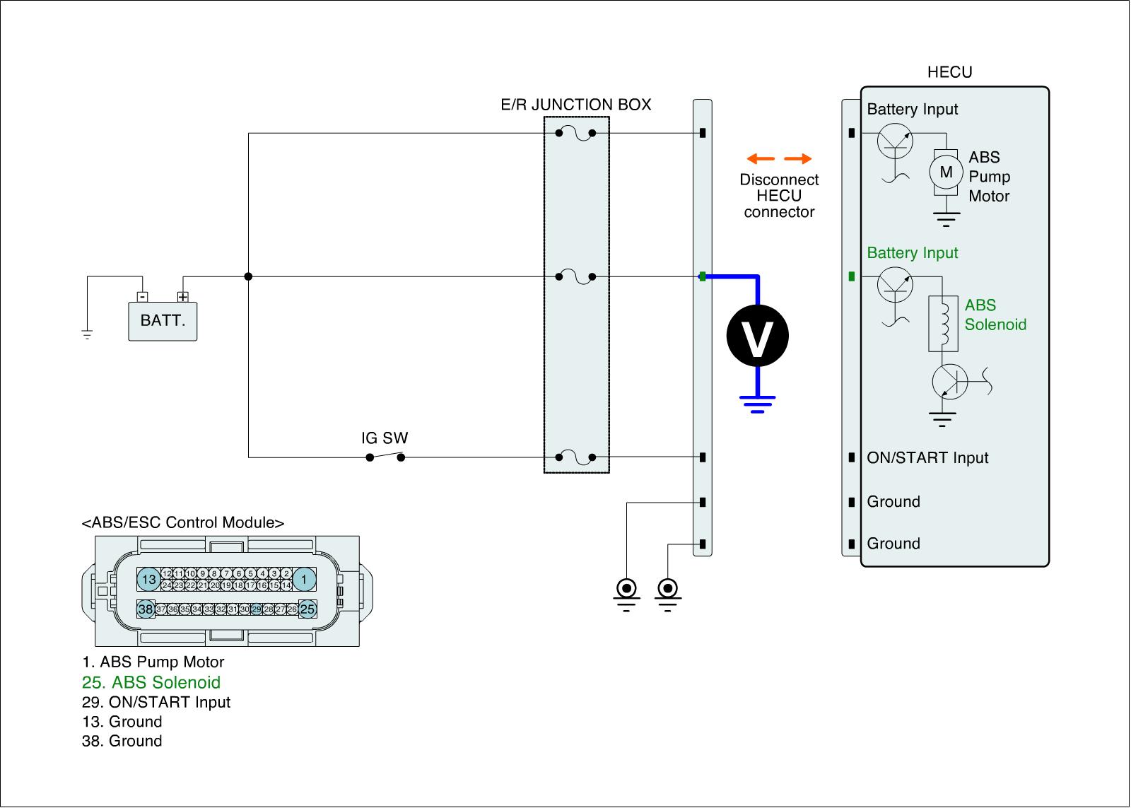 2. Measure voltage between valve relay power terminal of the HECU harness connector and chassis ground.
