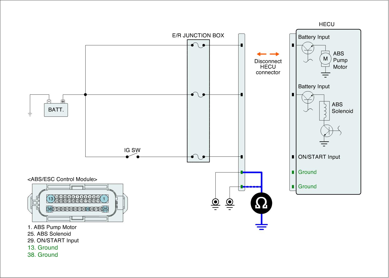 3. Measure resistance between ground terminal of the HECU harness connector and chassis ground.