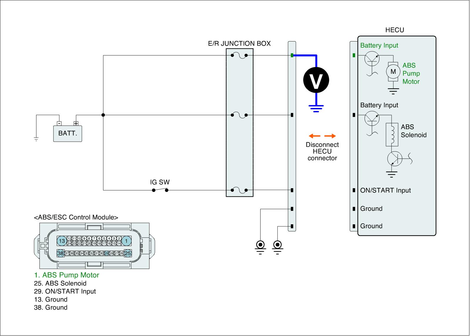 2. Measure voltage between motor power terminal of the HECU harness connector and chassis ground.