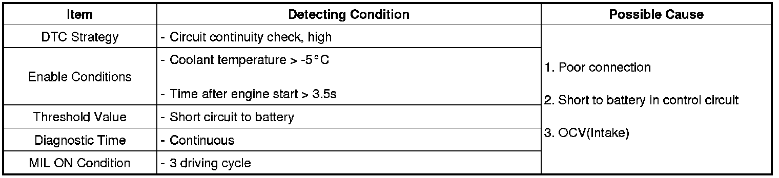 When ECM detects short to power in OCV(Intake) control circuit, ECM sets DTC P0077.