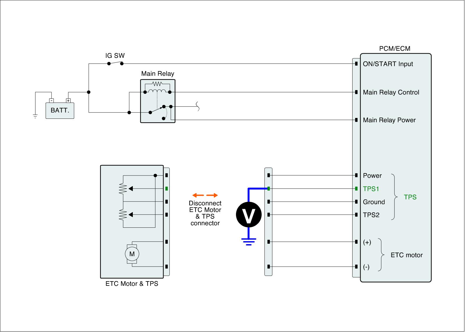 3. Measure voltage between TPS1 power terminal of ETC Motor & TPS harness connector and chassis ground.