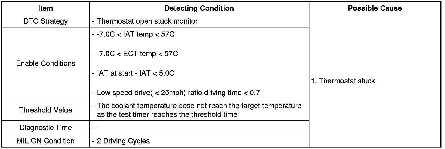 Checking time and coolant temperature under detecting condition, if the coolant temperature dose not reach the target temperature as the test timer reaches the threshold time, ECM sets P0128.