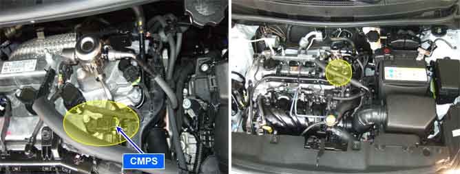 Camshaft Position Sensor (CMPS) is a hall sensor and detects the camshaft position by using a hall element. It is related with Crankshaft Position Sensor (CKPS) and detects the piston position of the each cylinder which the CKPS can't detect. The CMPS are installed on engine head cover and uses a target wheel installed on the camshaft. This sensor has a hall-effect IC which output voltage changes when magnetic field is made on the IC with current flow. When teeth on the target wheel trigger the sensor, output voltage is 5V. If not, it is 0V. These CMP signal is sent to the ECM and used for determining the ignition timing along with CKP signal. CMPS makes Sequential Injection possible.