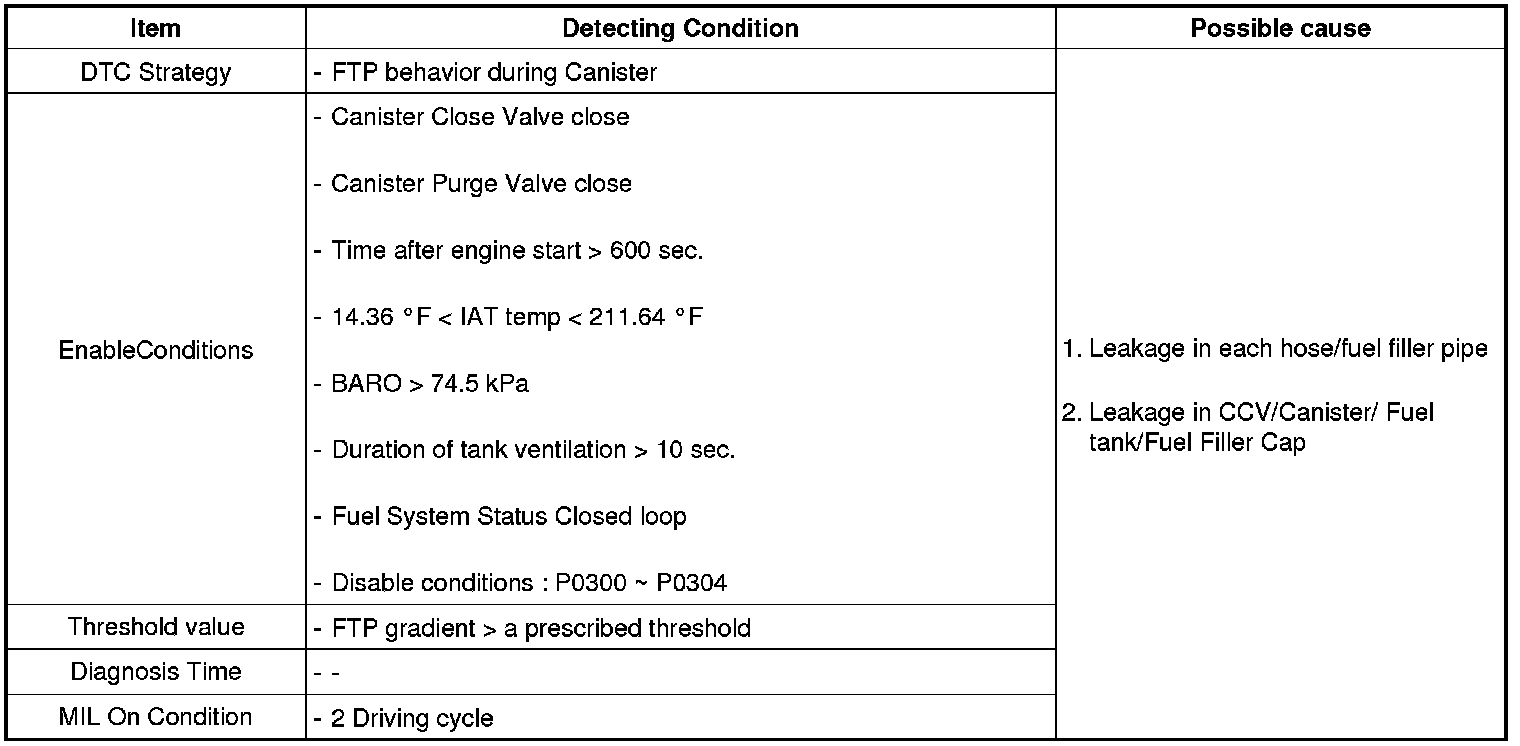 Checking output signals from fuel tank pressure sensor under evap.system test, if fuel tank's vacuum decay slope is higher than prescribed threshold, ECM sets P0442 and then MIL(Malfunction Indication Lamp) turns on.