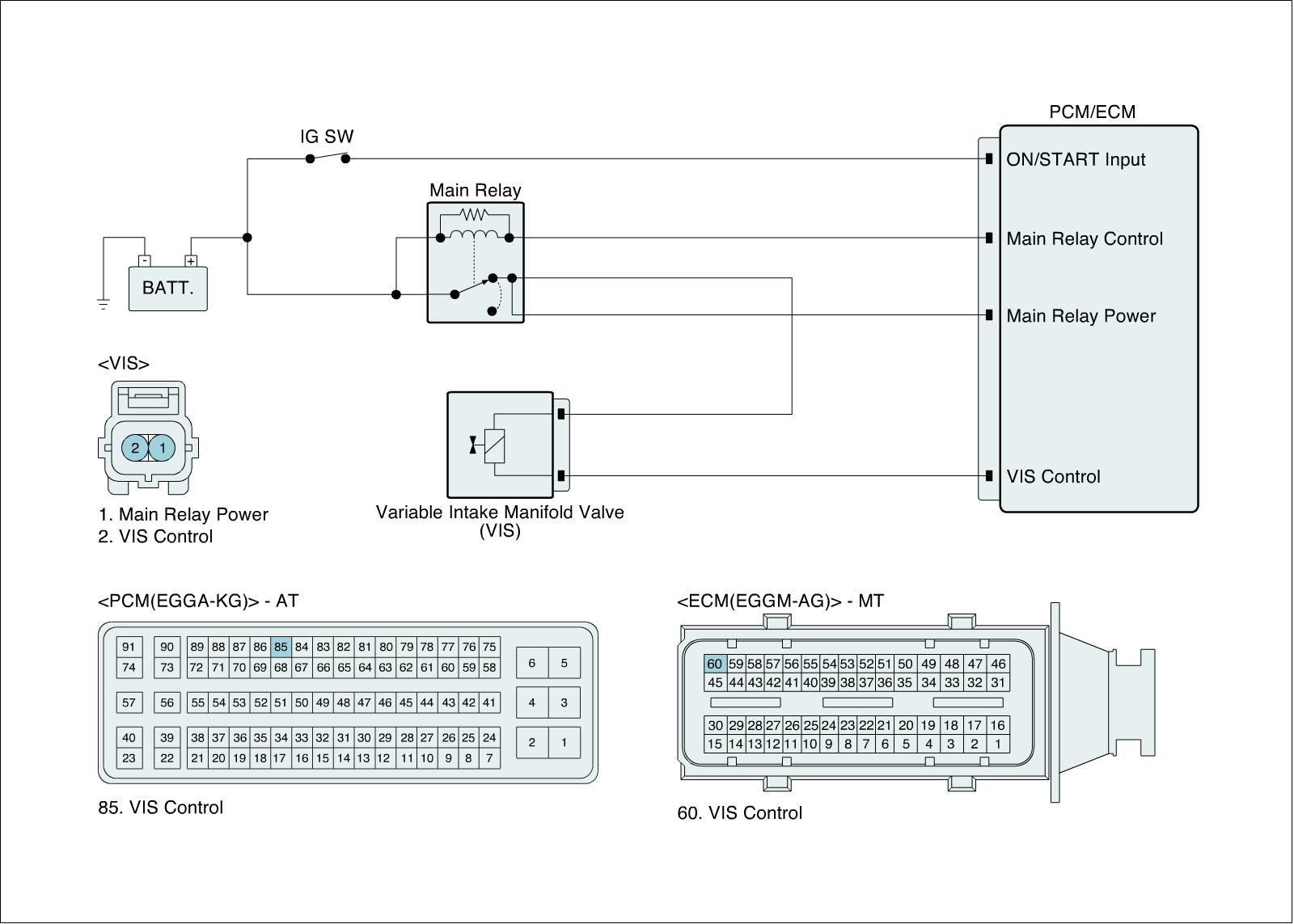 VIS(Variable intake system) is a device which varies the length of intake manifold to genetate maximum power at certain RPM. VIS lengthens intake manifold to improve the torque at low RPM when vehicle speed is low while it shortens intake manifold to raise torque at high RPM when vehicle speed is high. ECU controlls VIS using RPM signal.