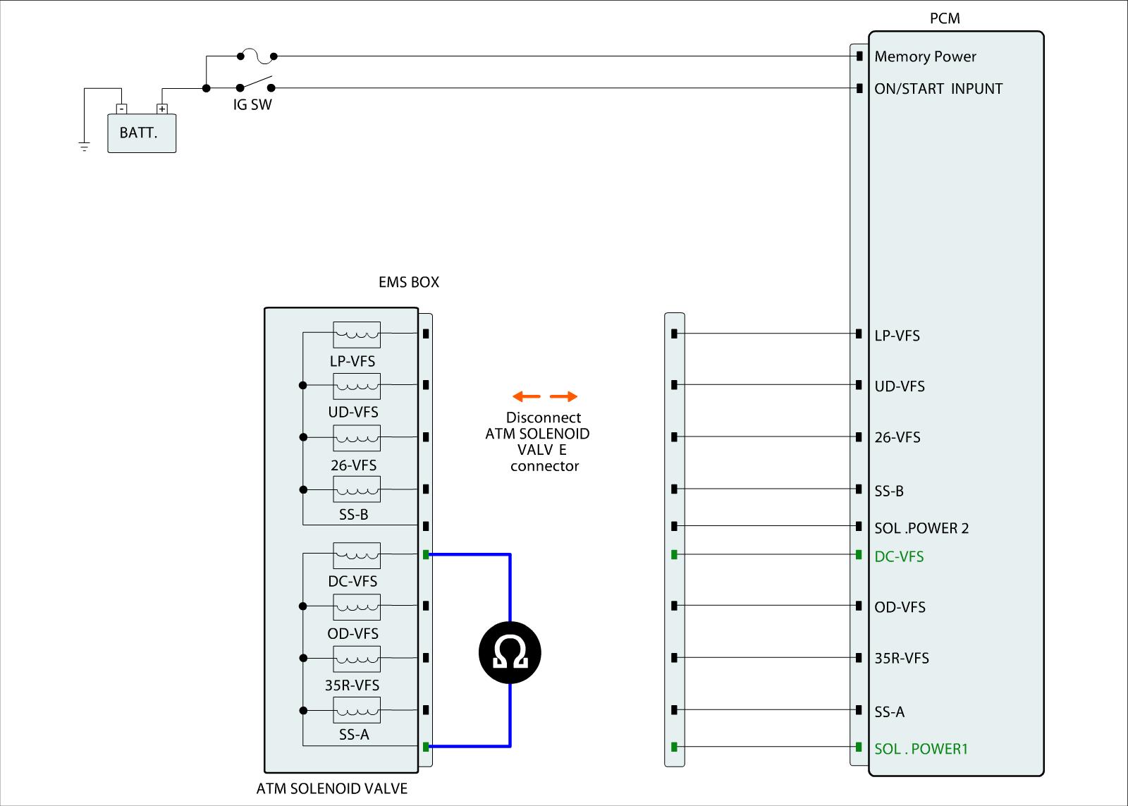 3. Measure resistance between DC solenoide vale terminal of ATM solenoid valve component and ON/START power.