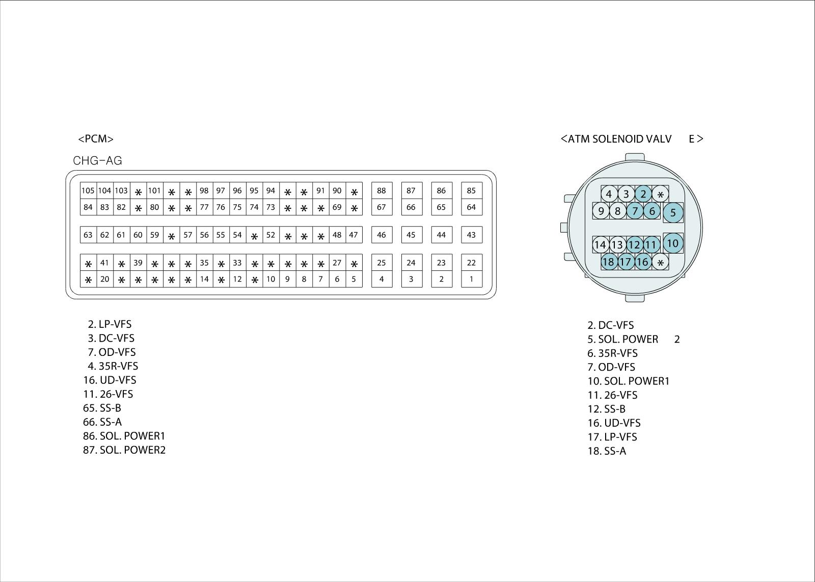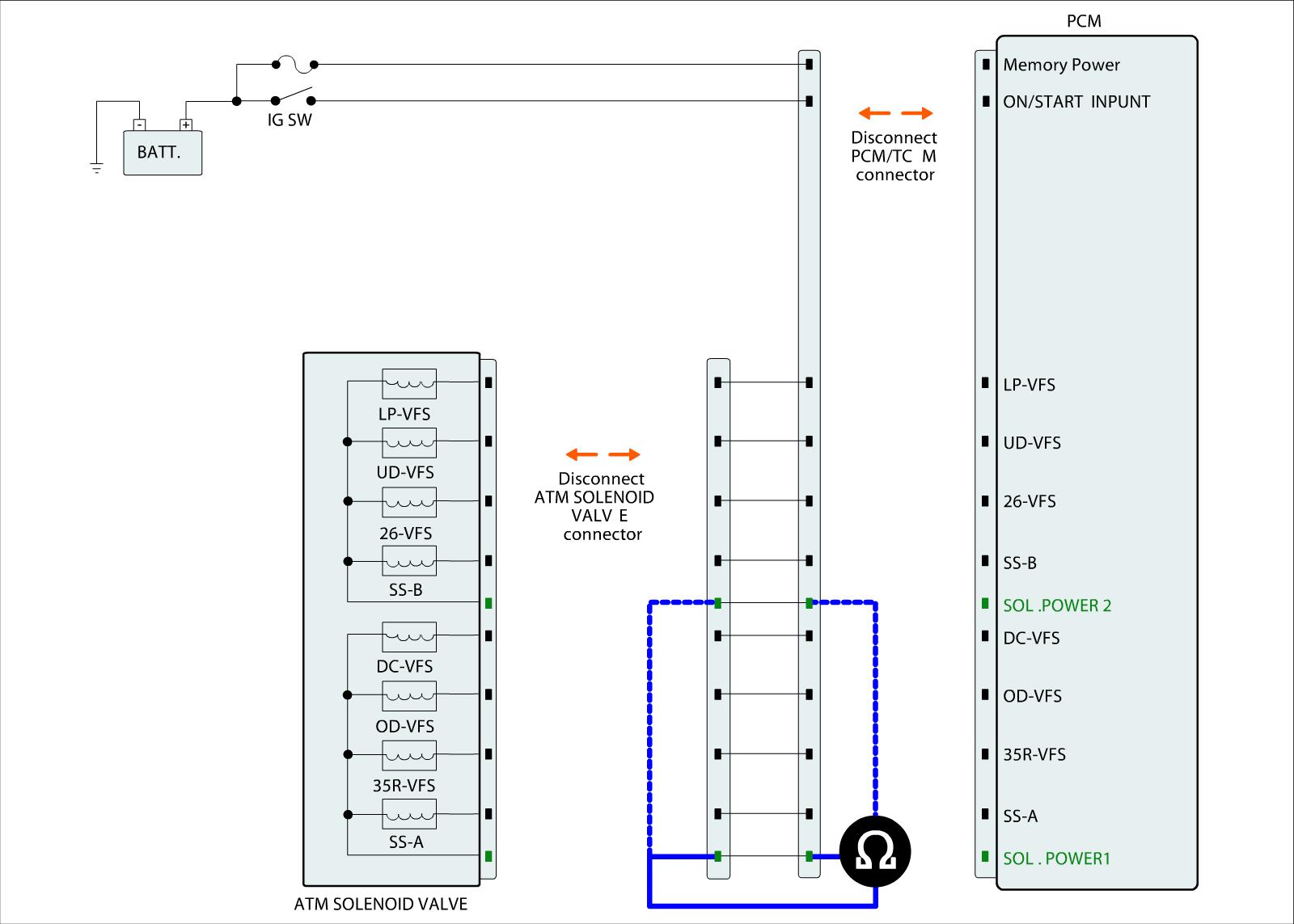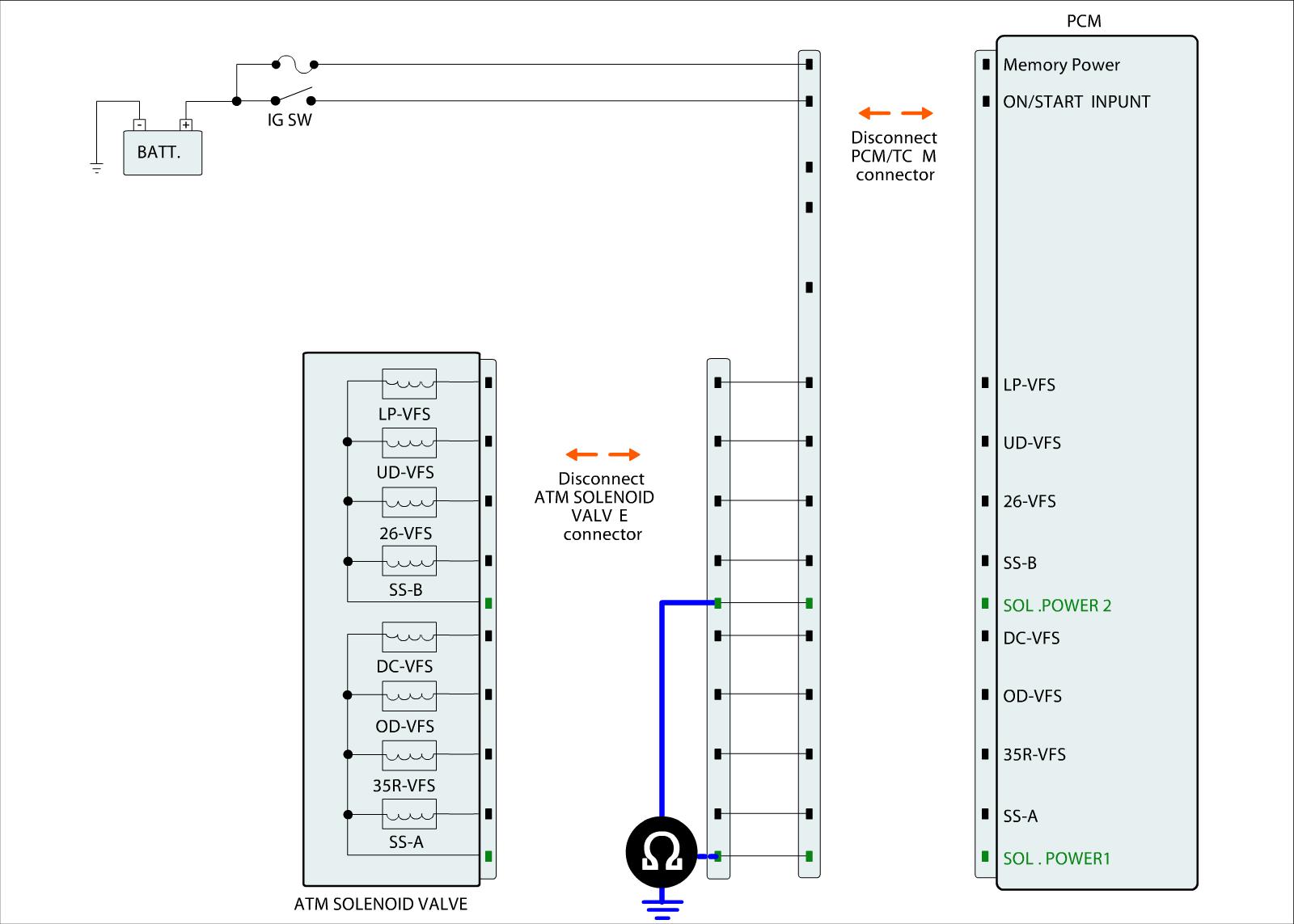 3. Measure resistance between power of ATM solenoid valve connector and power of PCM TCM connector.