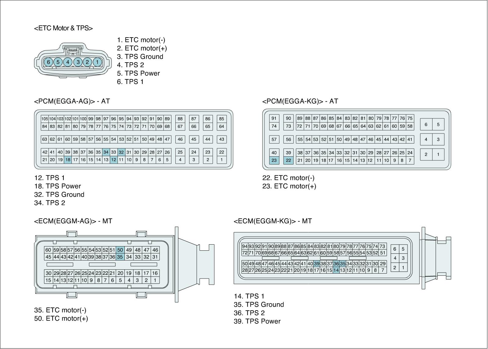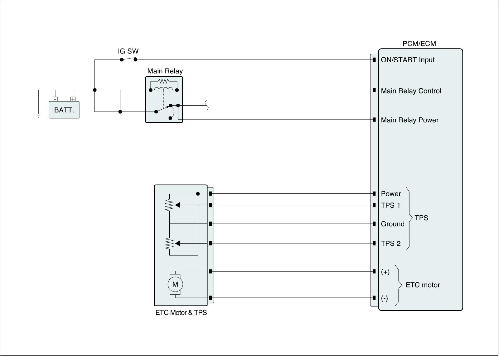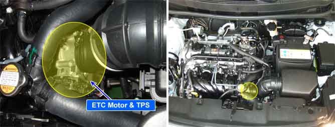 The Electronic Throttle Control(ETC) system is made of the components throttle body, Throttle Position Sensor(TPS)1&2 and Accelerator Position Sensor(APS) 1&2. The throttle body contains the actuator, the throttle plate and the throttle position sensor (potentiometer), which are integrated in one housing. The actuator consists of a DC motor with a two-stage gear. The opening angle of the throttle valve is detected by the throttle position sensor which is mounted on the throttle body. And it provides feedback to the ECM to control the throttle motor in order to control the throttle valve opening angle properly in response to the driving condition.