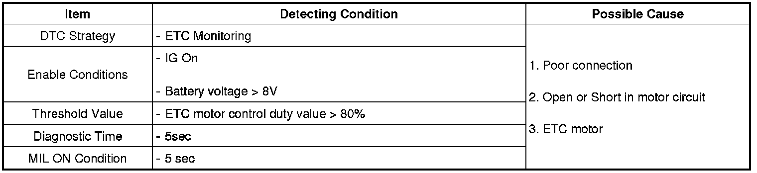 When the ETC motor control duty value is over 80% and 5 sec, ECM recognizes it as throttle valve sticking and sends P2118.