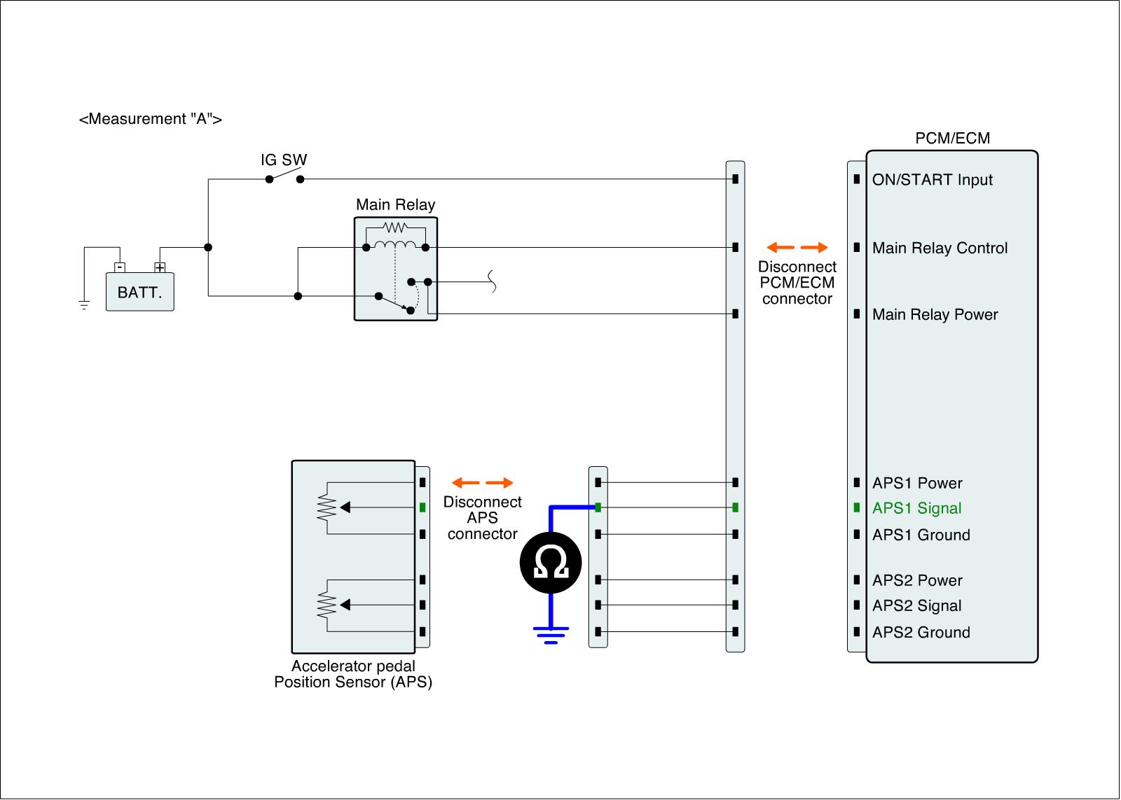 4. Measure resistance between APS1 signal and APS1(2) ground terminals of APS harness connector.(Measurement "B")