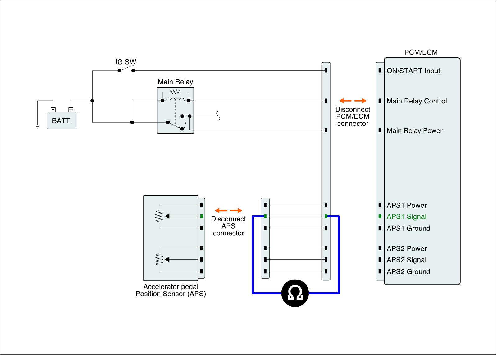 2. Measure resistance between APS1 signal terminal of APS harness connector and APS1 signal terminal of ECM harness connector.