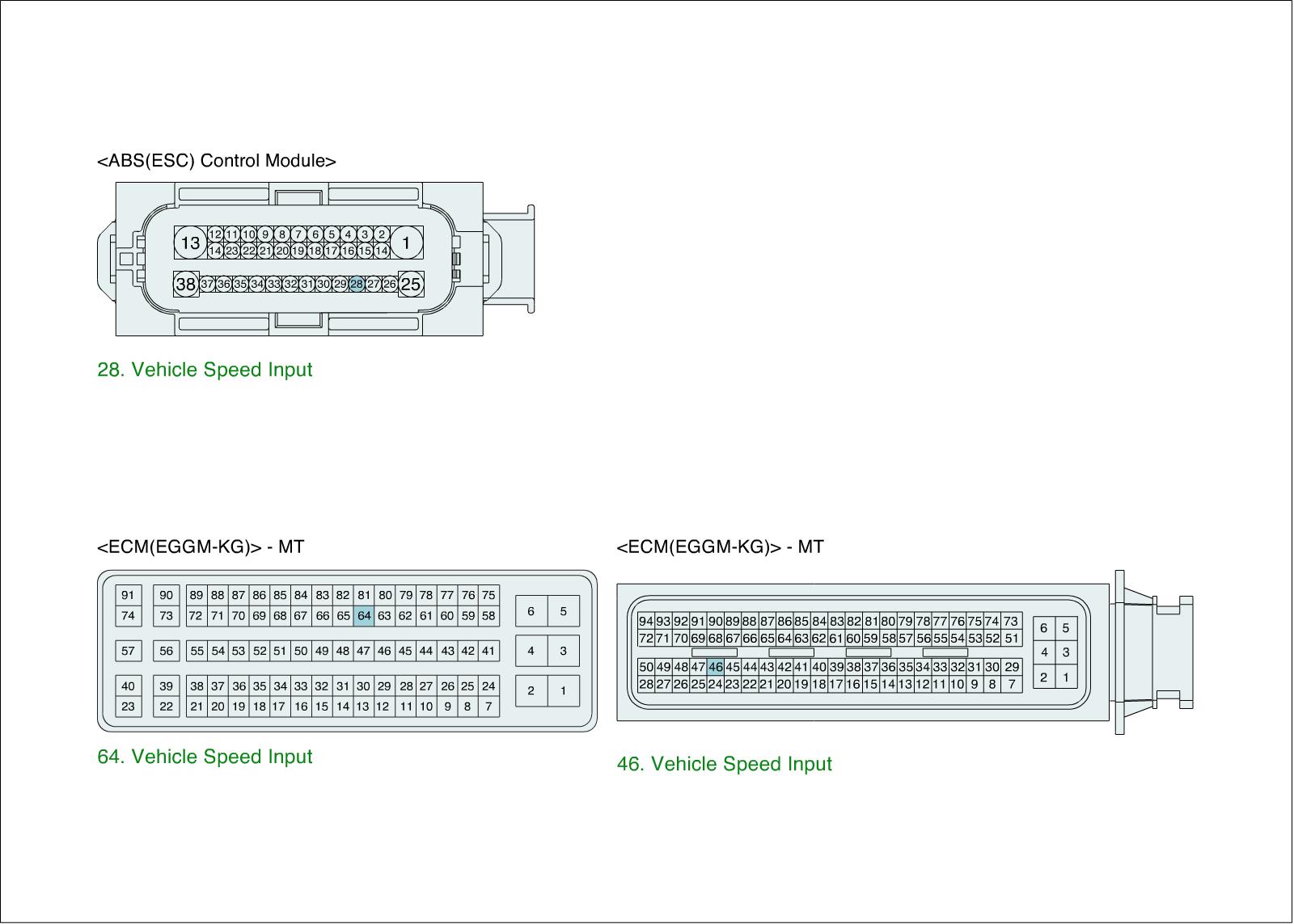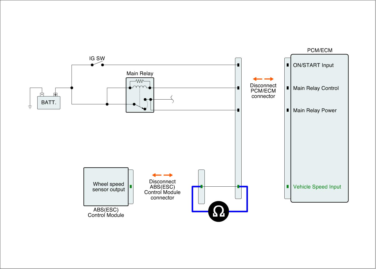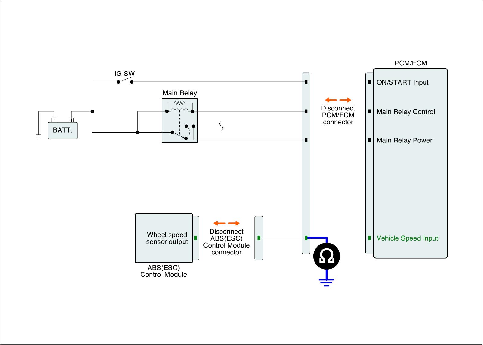 4. Measure resistance between speed signal terminal of ECM harness connector and speed signal signal of ABS(ESP) control module harness connector.