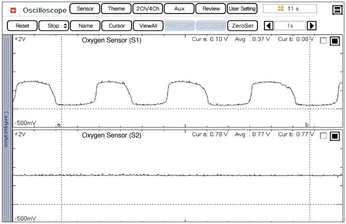 If you release the accelerator pedal suddenly after engine running about 4000 rpm, fuel supply will stop for short period and the O2 sensor service data in the Hi-Scan (Pro) will display values 200mV or lower. When you suddenly press on the accelerator pedal down, the voltage will reach 0.6 - 1.0 V. When you let the engine idle again, the voltage will fluctuate between 200 mV or lower and 0.6 - 1.0 V. In this case, the O2sensor can be determined as good.