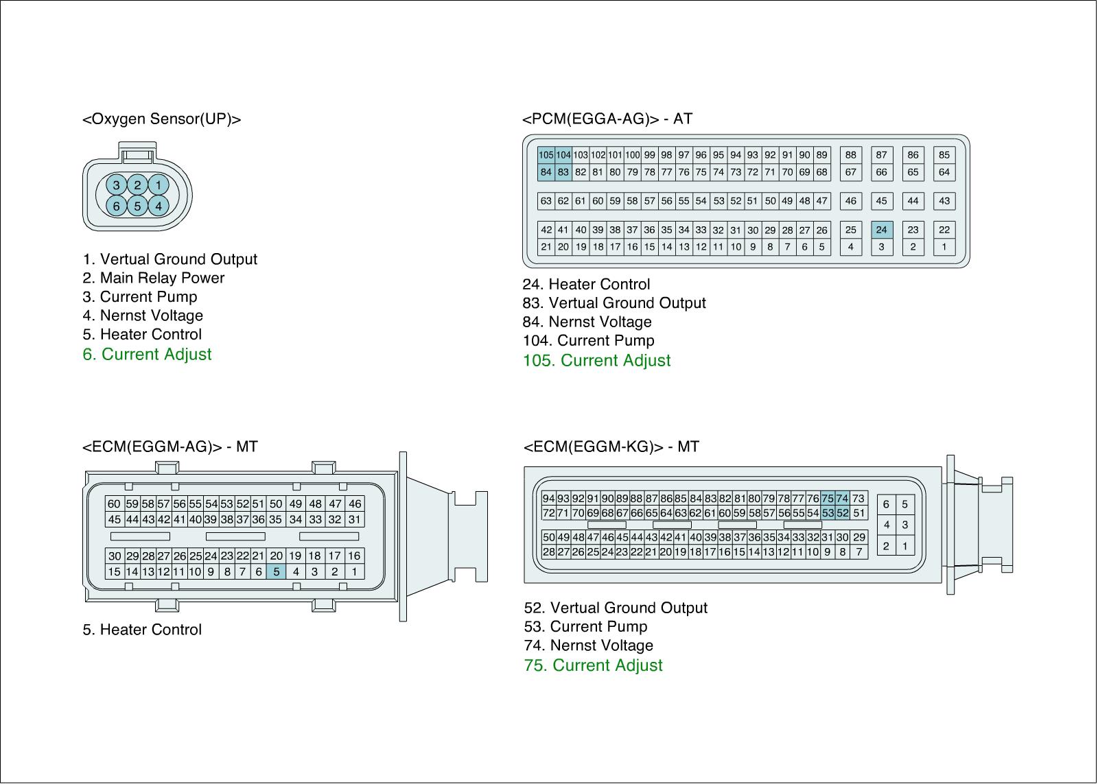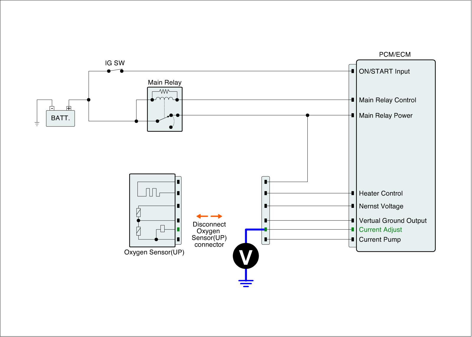 4. Measure the voltage between Current Adjust terminal of HO2S(S1) harness connector and chassis ground.