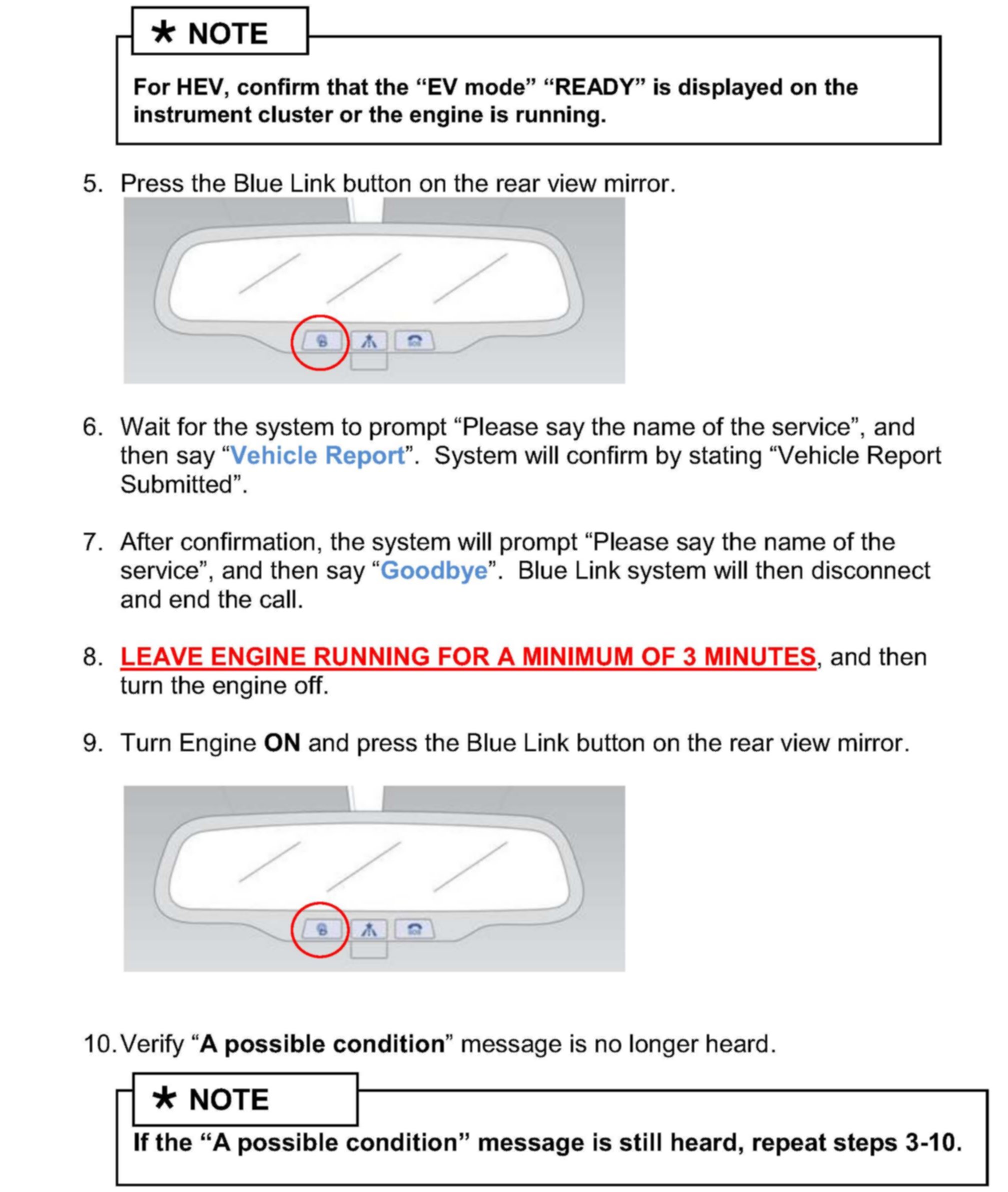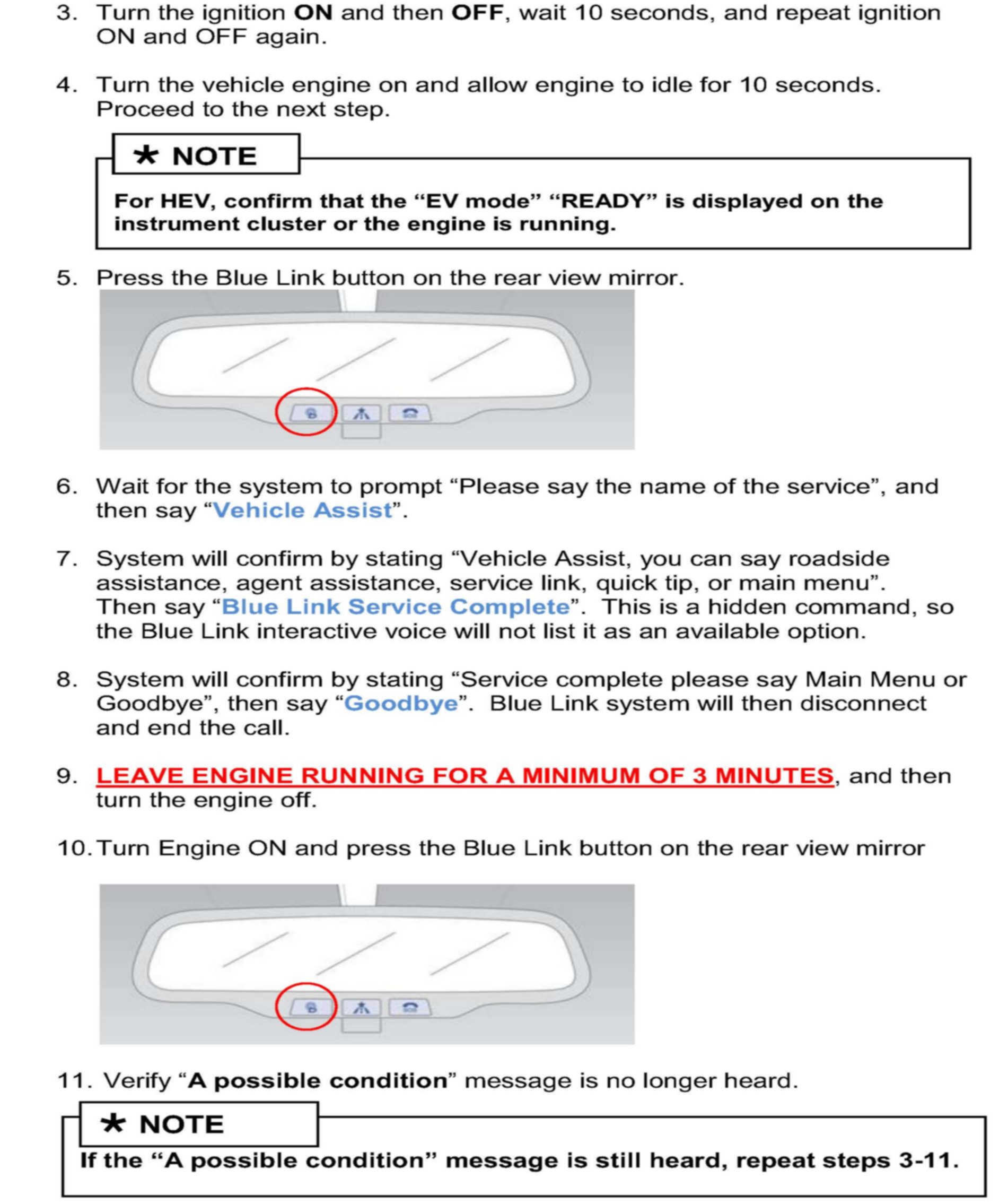 Failure to complete this procedure will result in the customer continuing to receive the Blue Link message stating that there is "A possible condition" or "Multiple conditions have occurred" with their vehicle and their Customer Web Portal home page continuing to show the Diagnostic Code(s) as current.