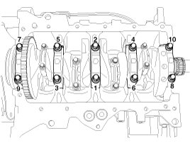 Install and uniformly tighten the 10 bearing cap bolts, in several passes, in the sequence shown.