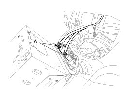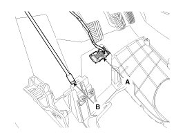 5. Disconnect the diagnosis connector (A) and hood release handle cable (B).