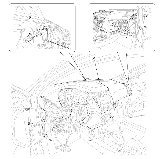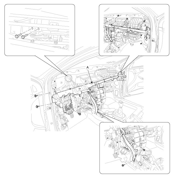 8. After loosening the mounting bolts, nuts, screws, then remove the main crash pad assembly (A).