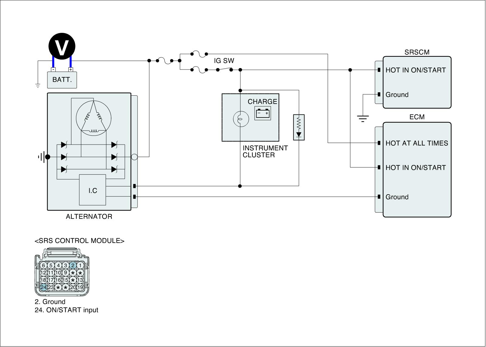 5. Measure voltage between power terminal of the SRSCM harness connector and chassis ground.