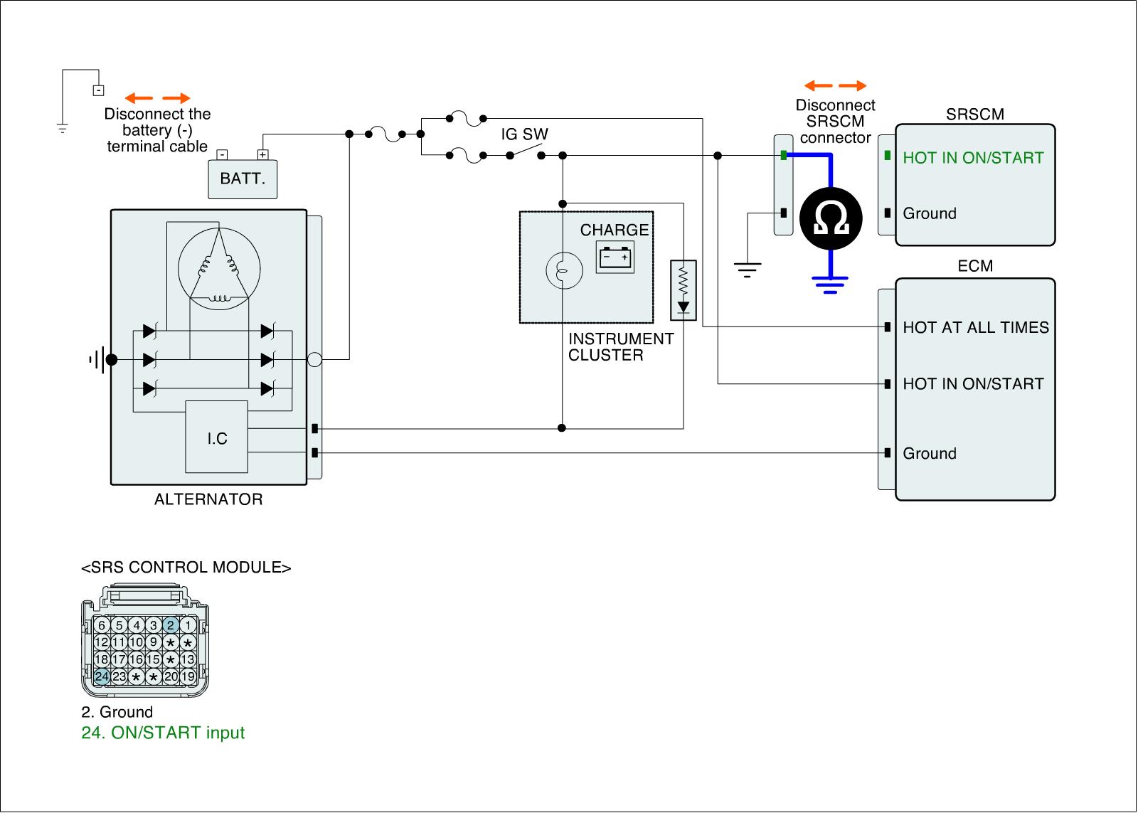 4. Measure resistance between ground terminal of the SRSCM harness connector and chassis ground.