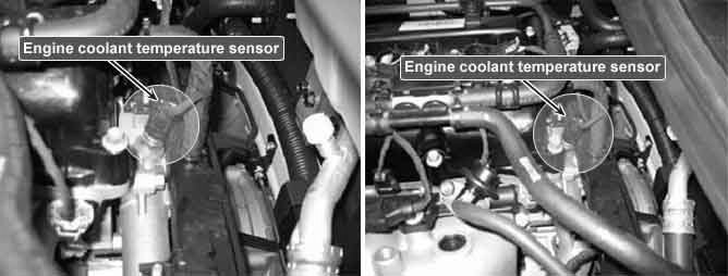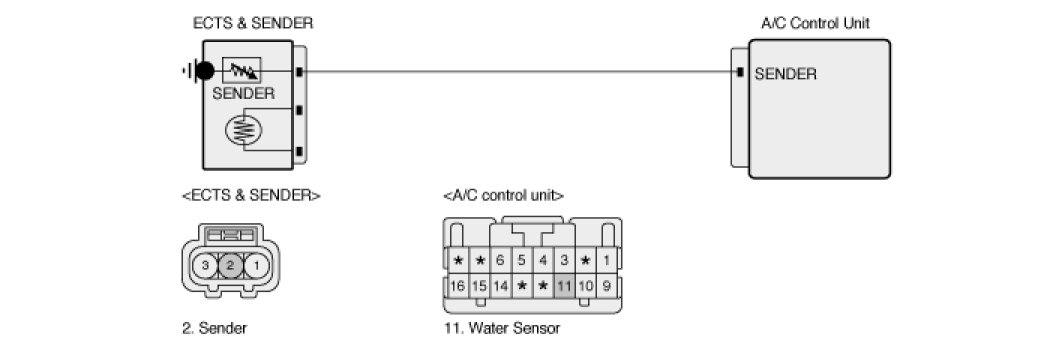 Engine coolant temperature sensor is located in the engine coolant passage of the cylinder head for detecting the engine coolant temperature. It contains negative type themistor whoses resistance value is in inverse proportion to temperature. Resistance of watersensor that varies with temperature makes signal voltage of A/C ECU change. In this way A/C ECU detects temperature. Signal of water sensor is used for cold engine lockout control - When the driver operates the heater before the engine is warmed up enough, to prevent driver from unpleasantness of cold air. the heater control unit reduces blower motor speed until coolant temperature reaches the threshold value.