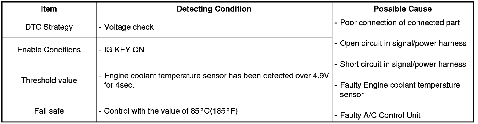 Air conditioner Control Module sets DTC B1202 if Engine coolant temperature sensor has been detected over 4.9V for 4sec.