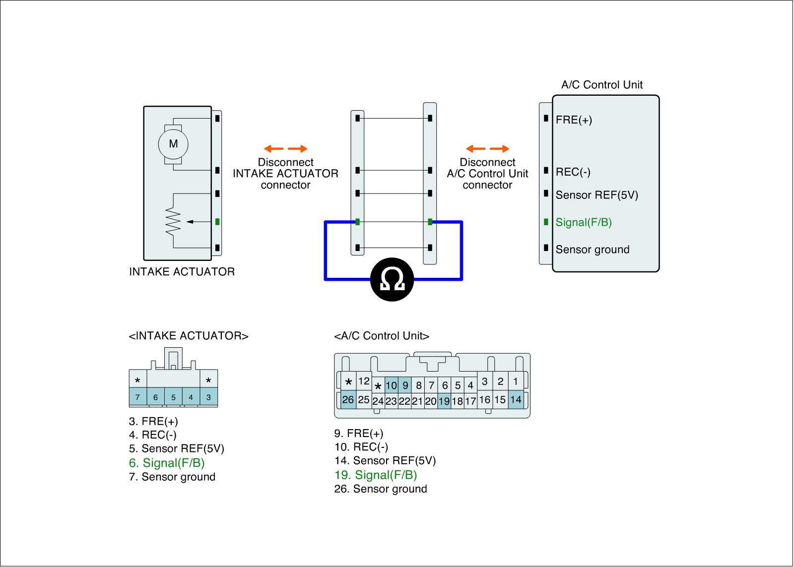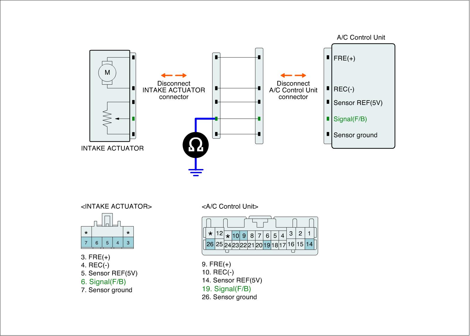 3. Measure resistance between Signal(F/B) terminal of Intake actuator harness connector and Signal(F/B) terminal of A/C-ECU harness connector.