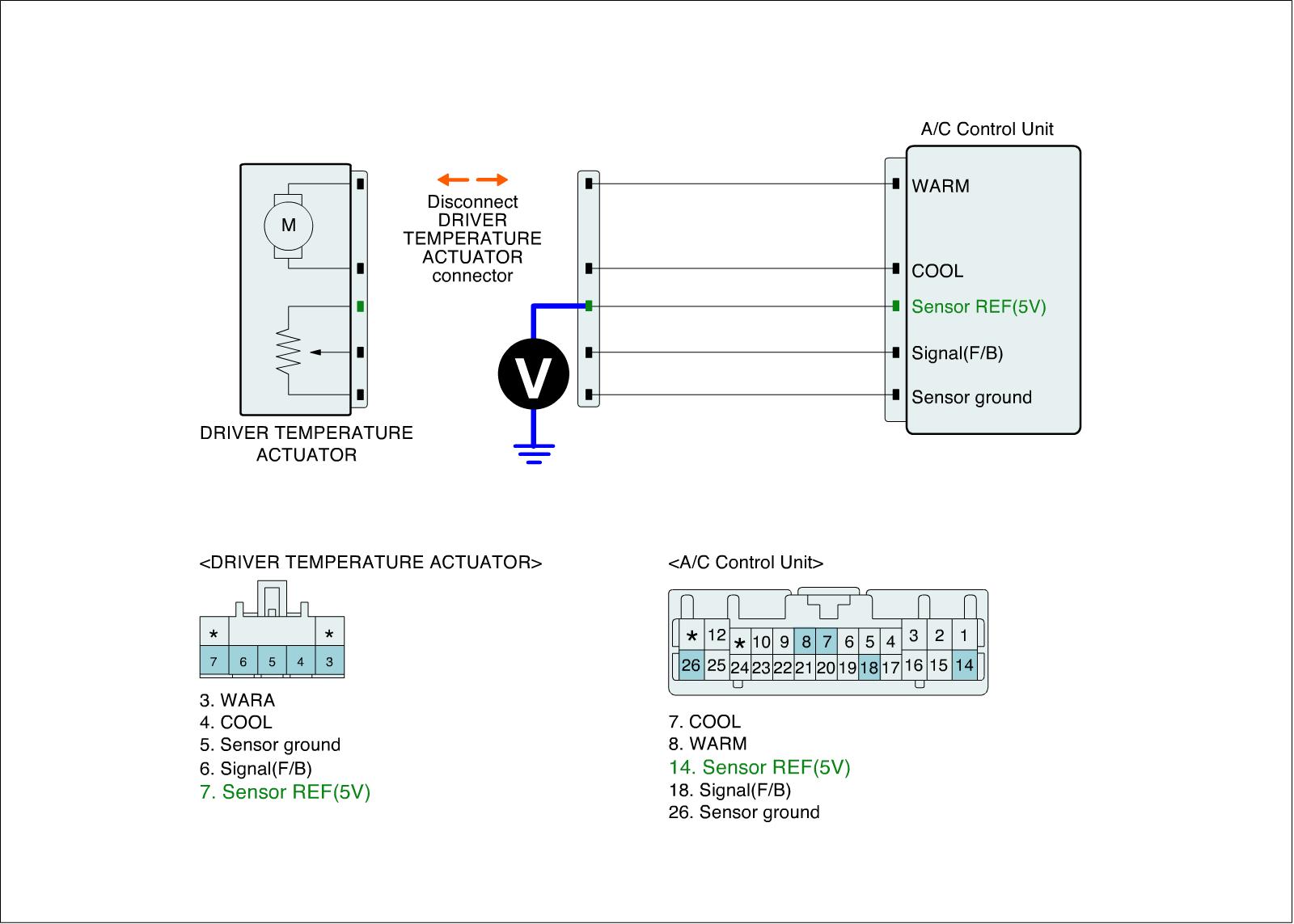 4. Measure voltage between Sensor REF(5V) terminal of Driver air mix actuator harness connector and chassis ground.