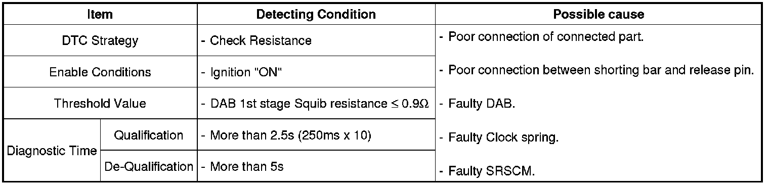 The SRSCM sets DTC B1347 if the measured resistance value of DAB circuit is less than the threshold value(1.0Ohms)