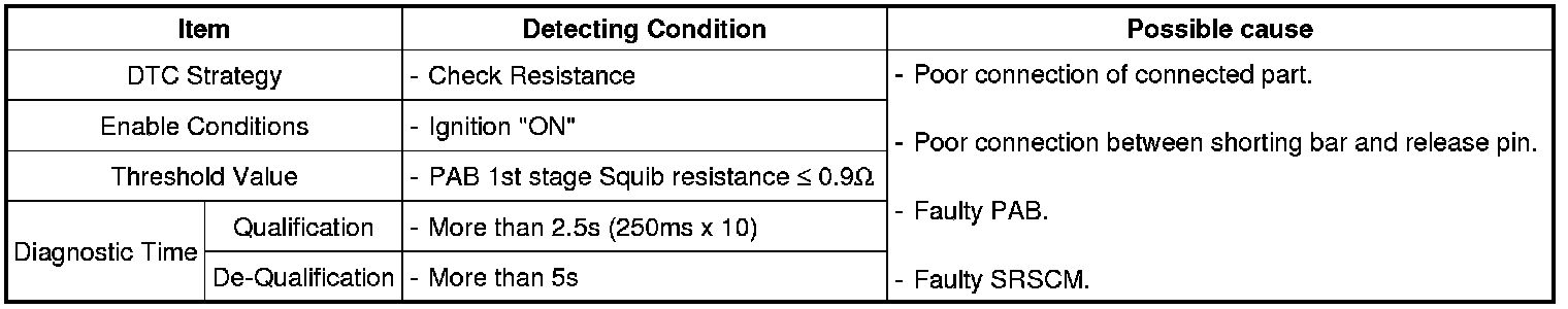 The SRSCM sets DTC B1353 if the measured resistance value of PAB circuit is less than the threshold value.