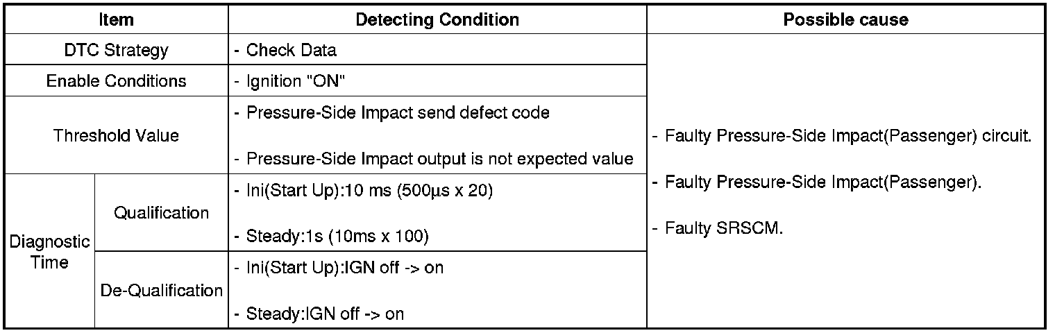The SRSCM sets DTC B1745 if there is any fault in Pressure-Side Impact(Passenger) circuit.