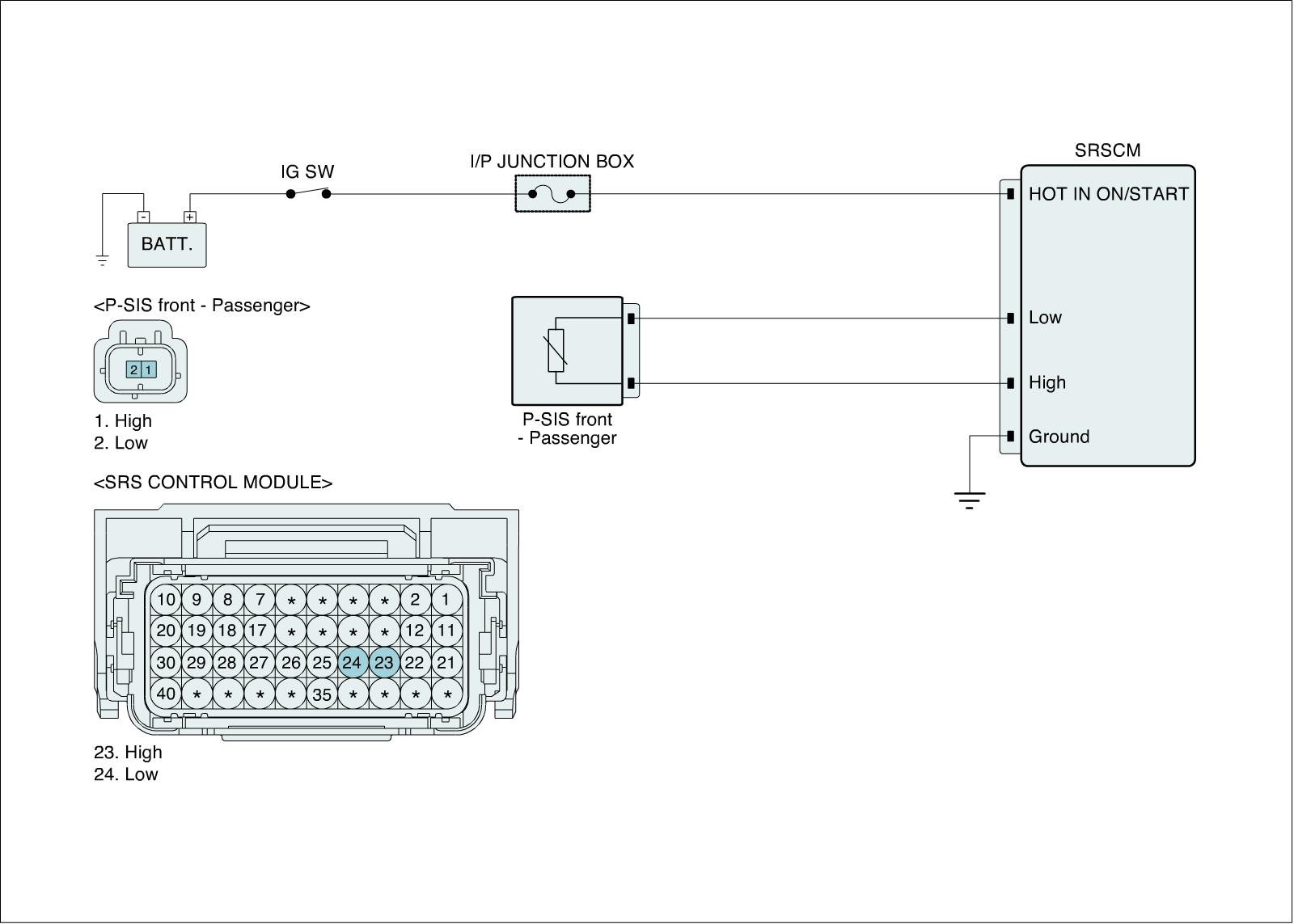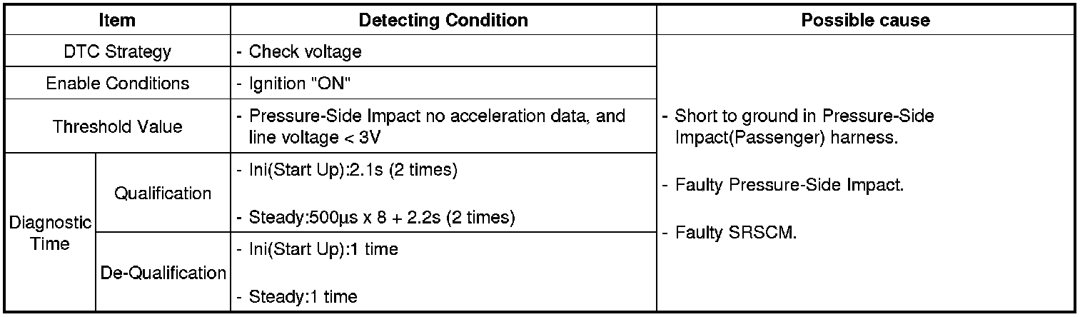 The SRSCM sets DTC B1746 if there is a short to ground in Pressure-Side Impact(Passenger) harness.
