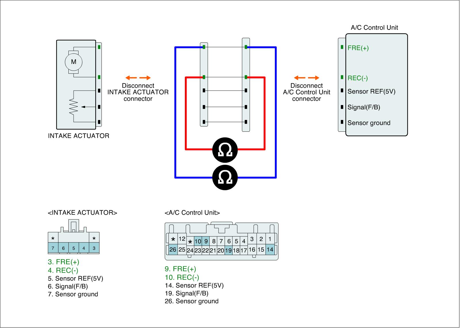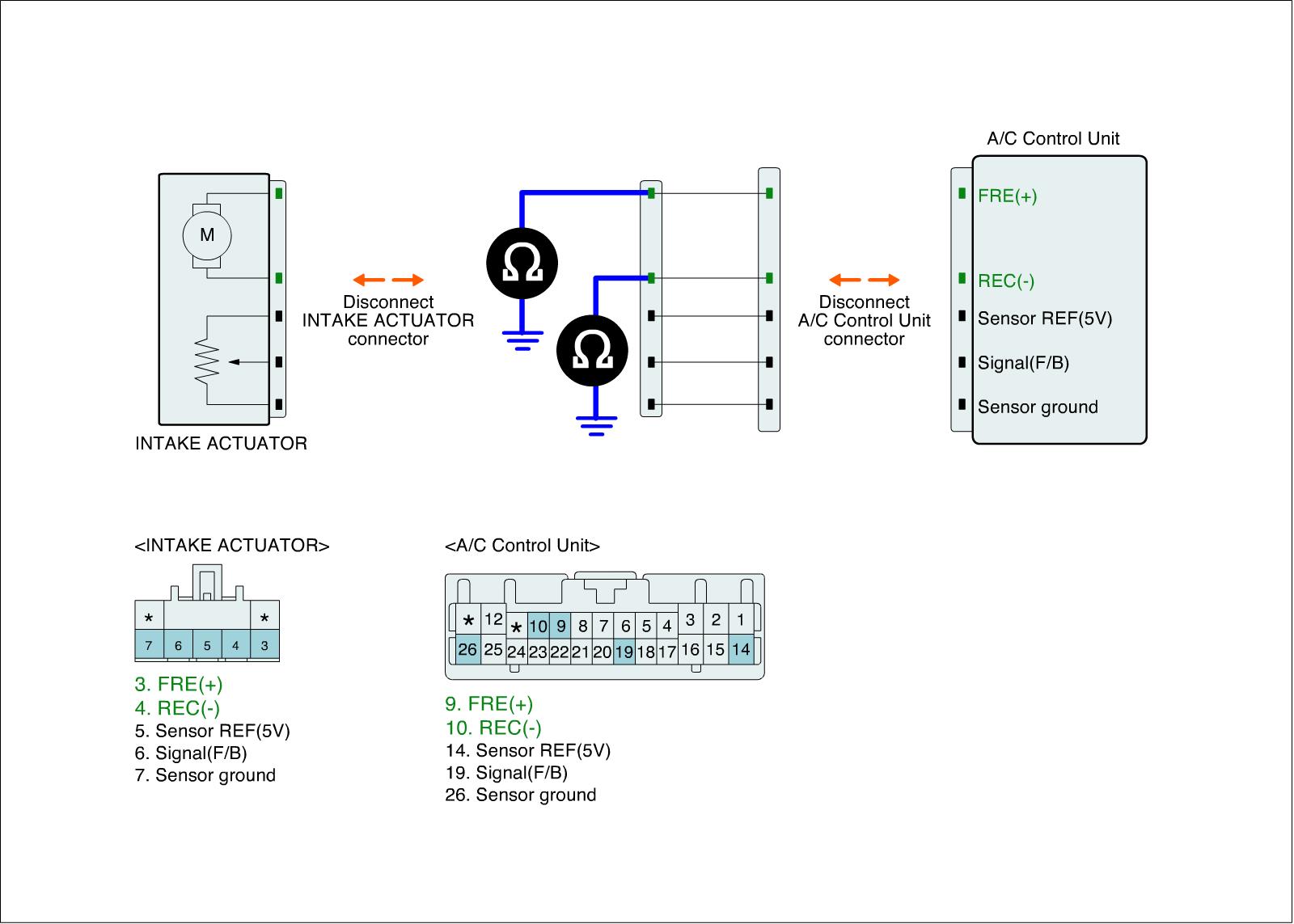 3. Measure resistance between FRE(+) terminal of Intake actuator harness connector and FRE(+) terminal of A/C-ECU harness connector.