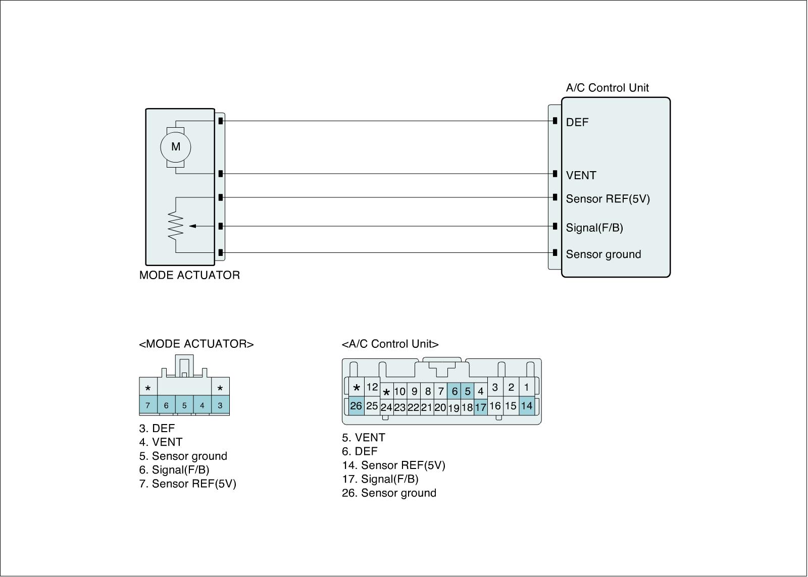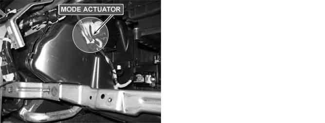 The mode control actuator mounted on heater unit adjusts position of mode door by operating Direction Motor in accordance with signal of A/C control unit. Pressing mode select switch makes the mode control actuator shift in order of vent-> B/L -> floor -> mix.