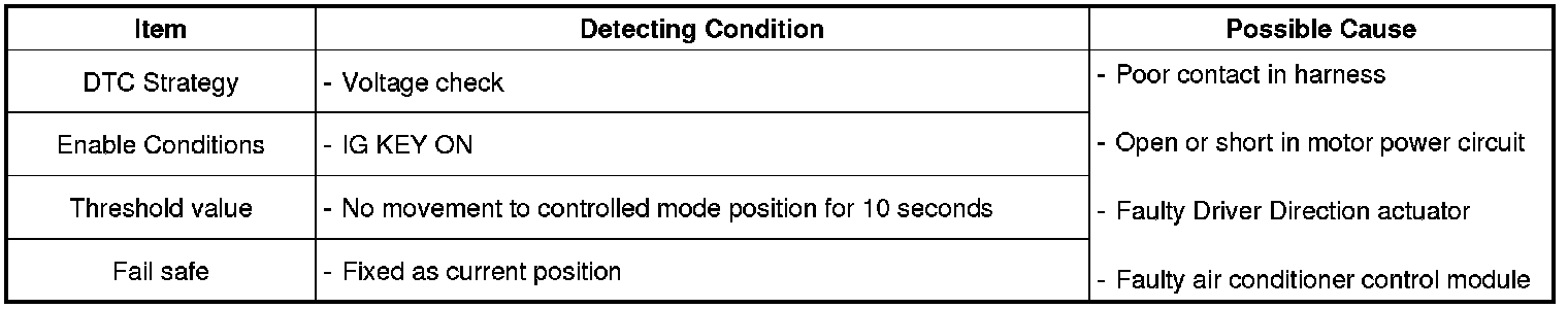 Air conditioner Control Module sets DTC B2409 if Driver Direction actuator has not been moved to the mode,where air condition control module controls, within 10 seconds.