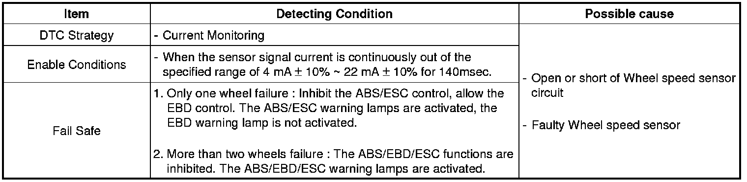 If the sensor signal current is continuously out of the specified range for 140msec, then the HECU determines that the circuit is open/short, and sets this code.