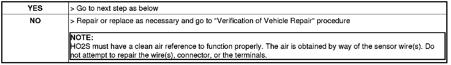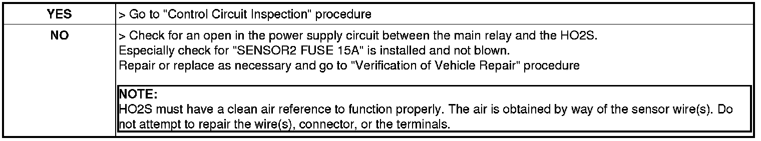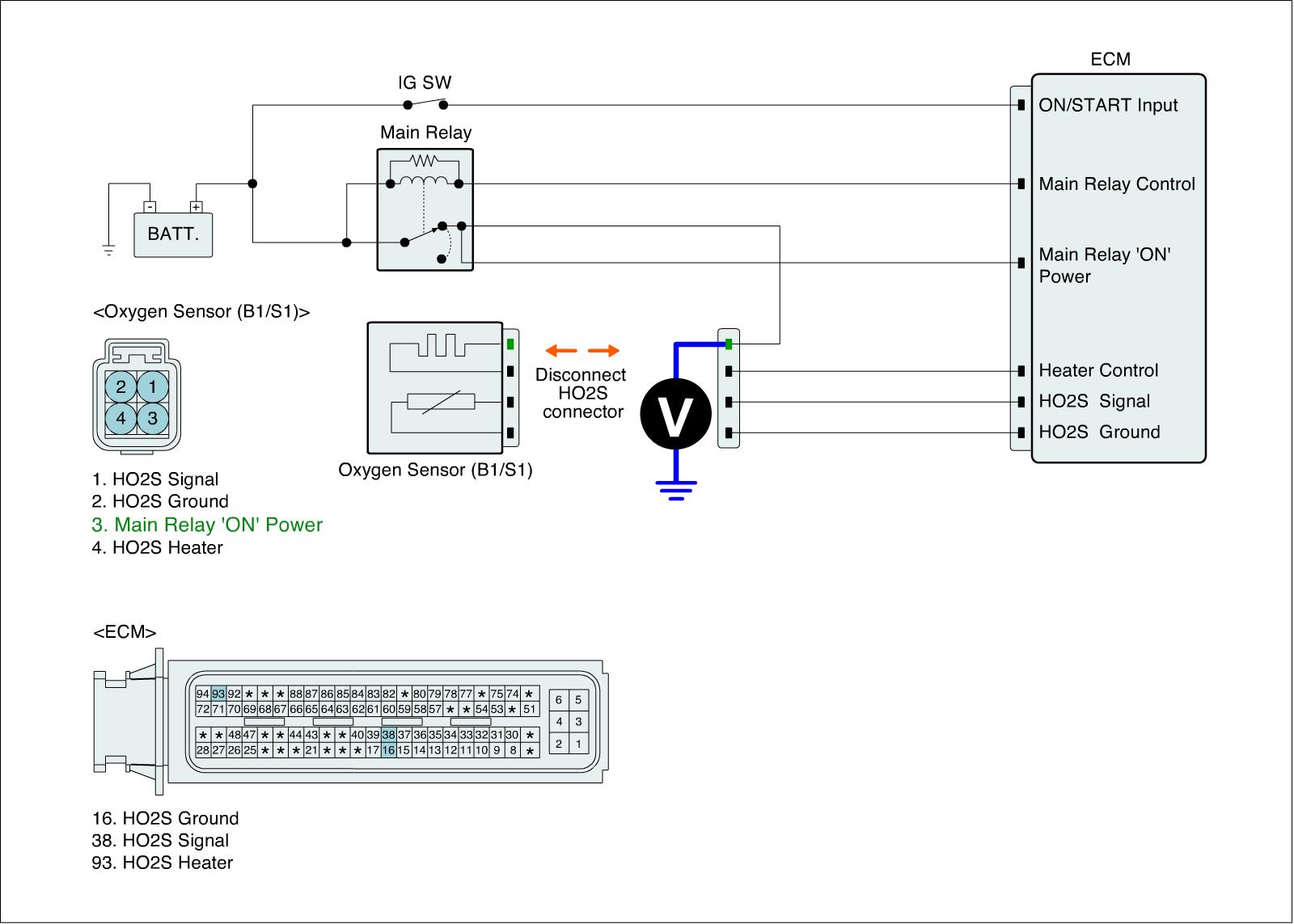 1. Measure voltage between control terminal of the HO2S heater harness connector and chassis ground.