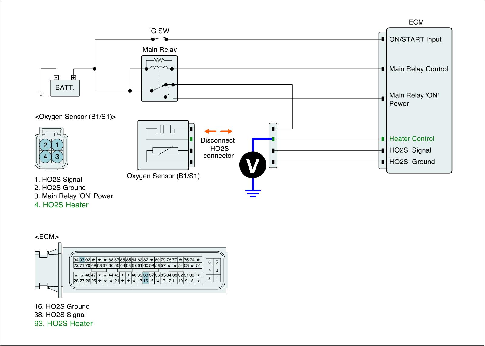 4. Measure voltage between control terminal of the HO2S heater harness connector and chassis ground.