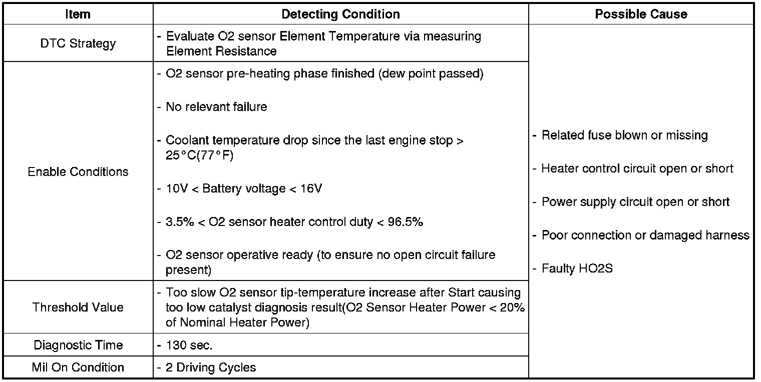 The normal operating temperature of the HO2S(Heated Oxygen Sensor) ranges from 350 to 850°C(662 to 1562°F). The HO2S heater greatly decreases the amount of time required for fuel control to become active. The ECM provides a pulse width modulated control circuit to adjust current through the heater. When the HO2S is cold, the value of the resistance is low and the current in the circuit is high. On the contrary, if the temperature in the resistor of the sensor rises, the current drops gradually.