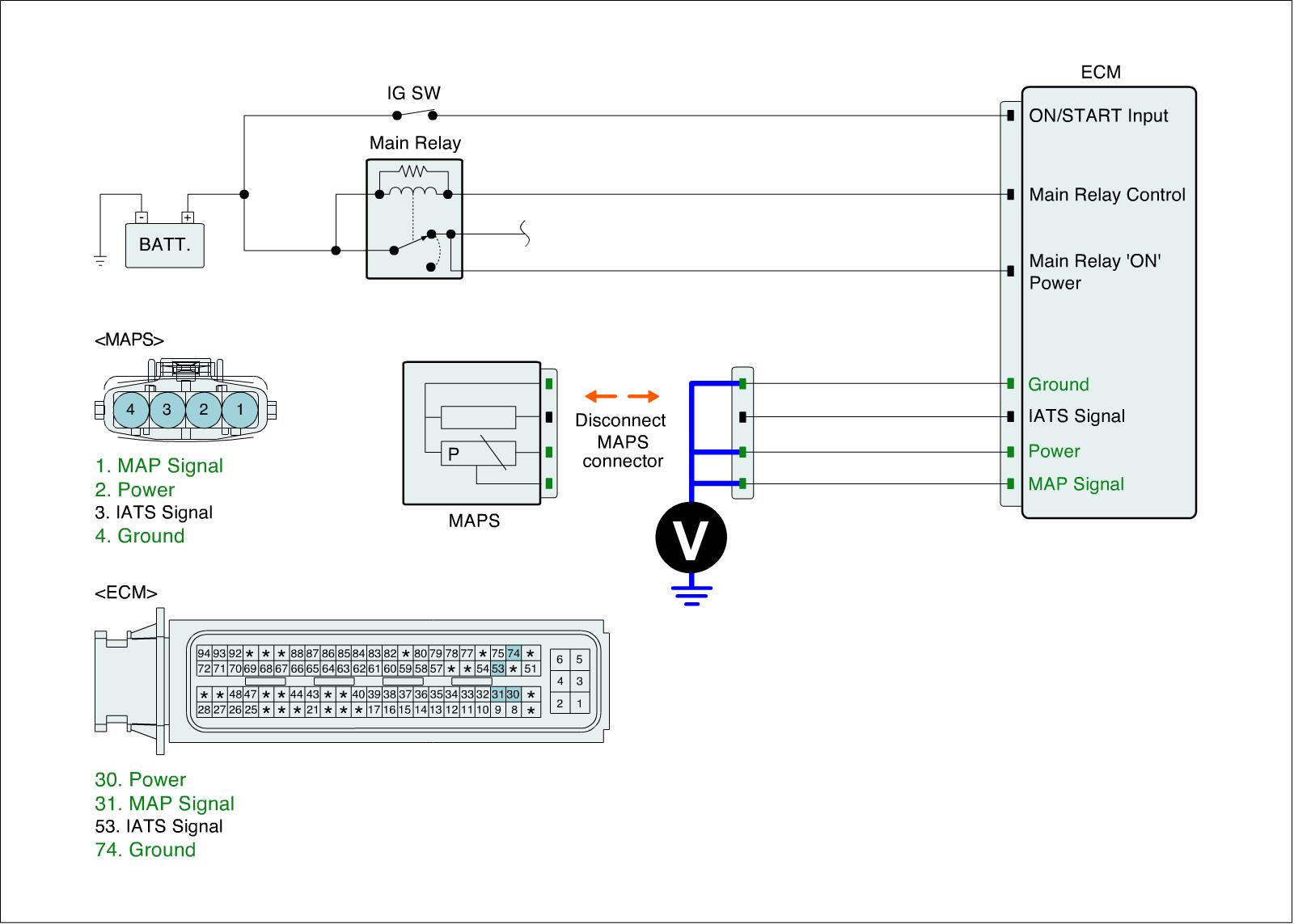 4. Measure voltage between each of signal / power / ground terminals of MAPS harness connector and chassis ground.