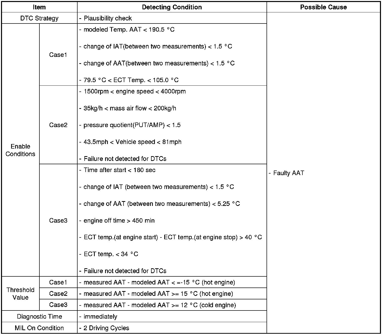 ECM sets DTC P0071 when the variation of measured ambient air temperature from cold(or warm) engine start is out of range in threshold value(refer to Detecting condition).