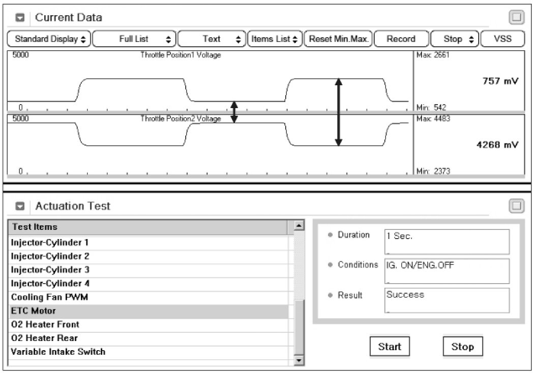 > During 'ETC Motor' test, TPS1 and TPS2 show symmetrical movements.