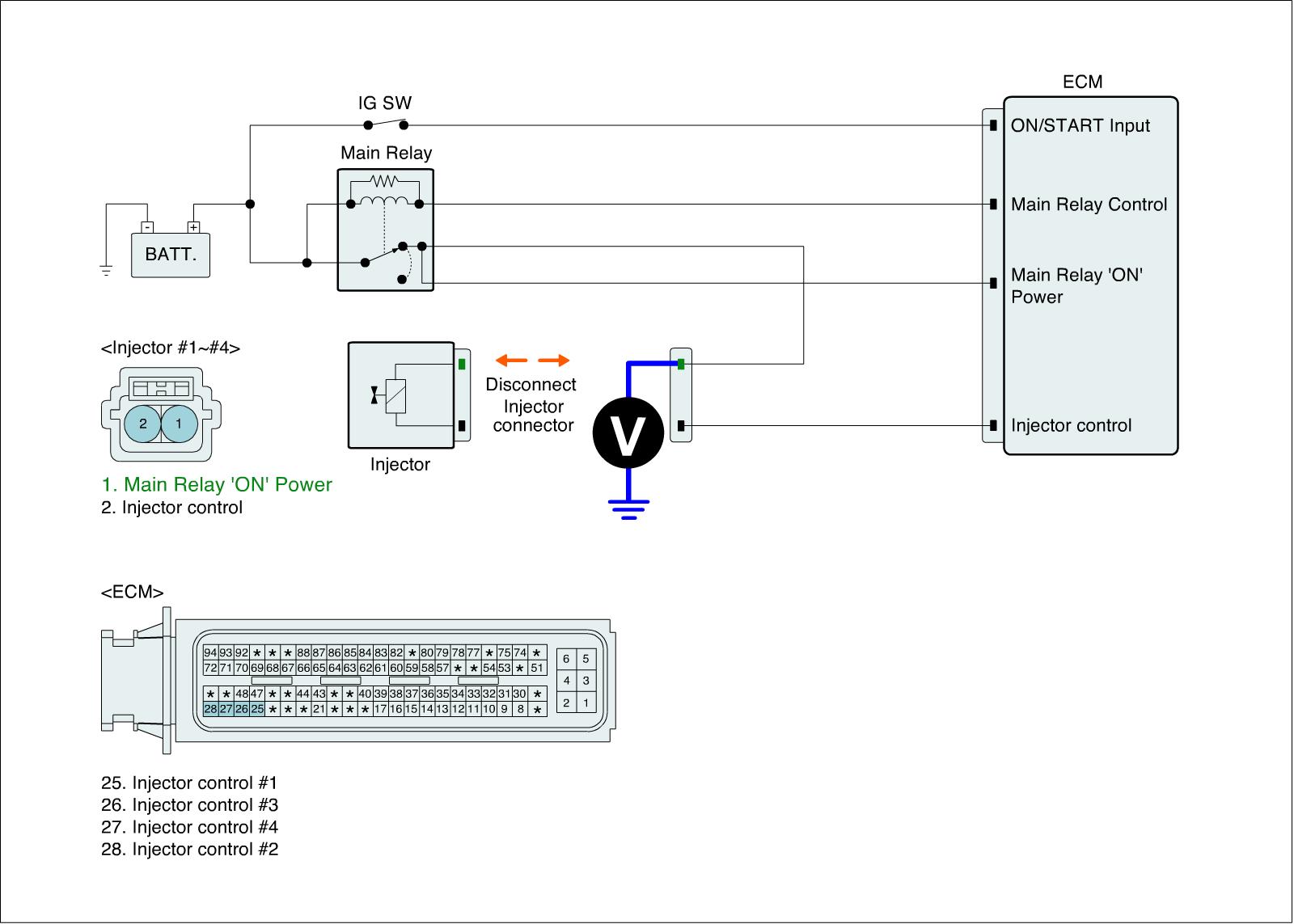 2. Measure voltage between power terminal of the injector harness connector and chassis ground.