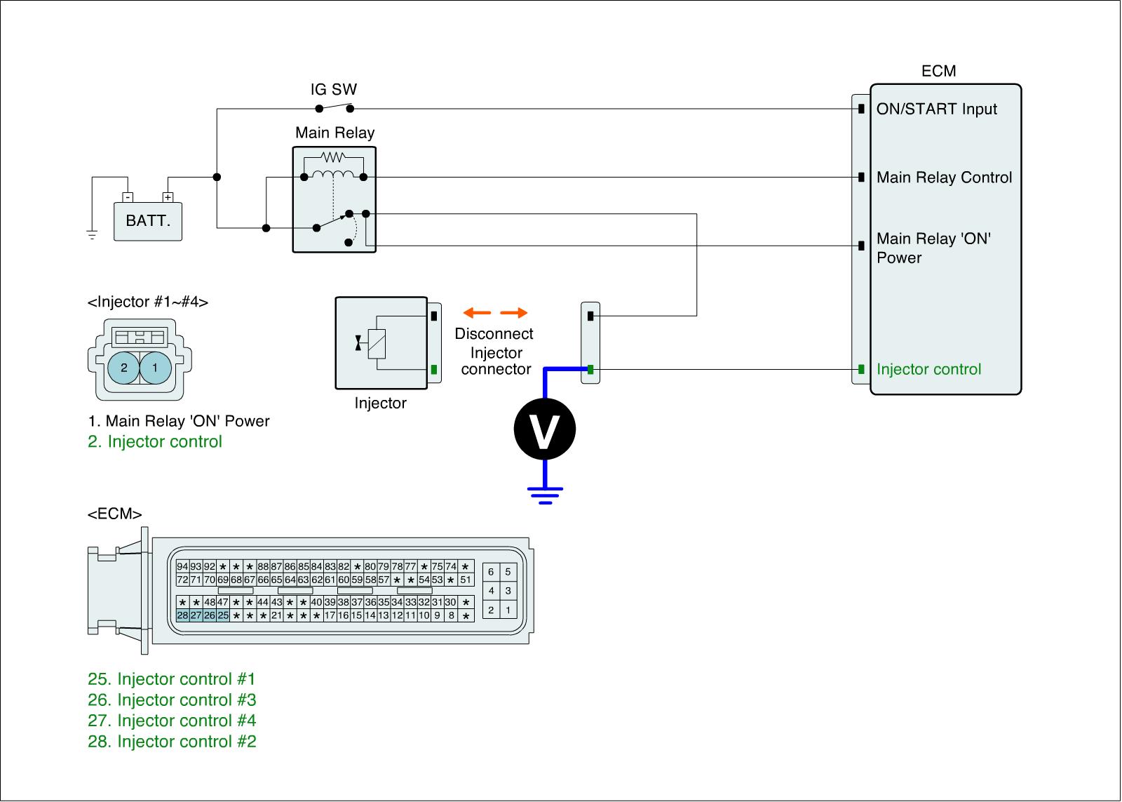2. Measure voltage between power terminal of the injector harness connector and chassis ground.