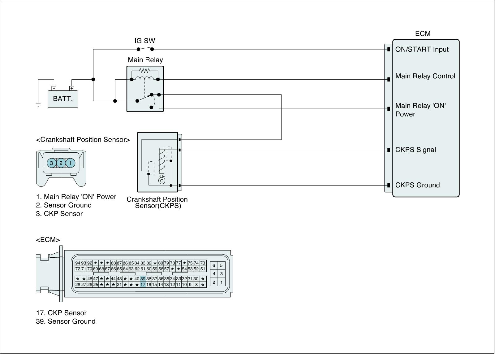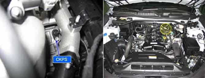 The Crankshaft Position Sensor (CKPS) is a hall effect type sensor that generates voltage using a sensor and a target wheel mounted on the crankshaft; there are 58 slots in the target wheel where one is longer than the others. When the slot in the wheel aligns with the sensor, the sensor voltage outputs low. When the metal (tooth) in the wheel aligns with the sensor, the sensor voltage outputs high. During one crankshaft rotation there are 58 rectangular signals and one longer signal. The ECM calculates engine RPM by using the sensor' s signal and controls the injection duration and the ignition timing. Using the signal differences caused by the longer slot, the ECM identifies which cylinder is at top dead center.