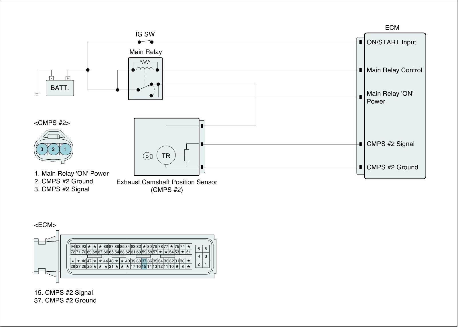 The Camshaft Position Sensor (CMPS) is a sensor that detects the compression TDC of the NO. 1 cylinder. The CMPS consists of a hall type sensor and a target on the end of the intake camshaft. When the target triggers the sensor, the sensor voltage is 5V. If not, the sensor voltage is 0V. These CMPS signal is sent to the ECM and the ECM uses the CMPS signal for synchronizing the firing of sequential fuel injectors.
