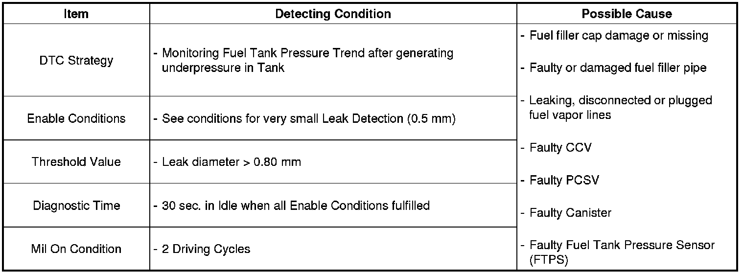 The ECM closes the Canister Close Valve (CCV) at the charcoal canister to seal off the evaporative emission system and then opens purge control valve (PCSV) to generate a vacuum in the fuel tank. After vacuum generation, the ECM measures pressure differential curve in the fuel tank and sets DTC P0442 or P0456 if the vacuum generated within a monitoring period increases above a defined threshold.If same error code is set in the next driving cycle, the ECM illuminates the MIL.