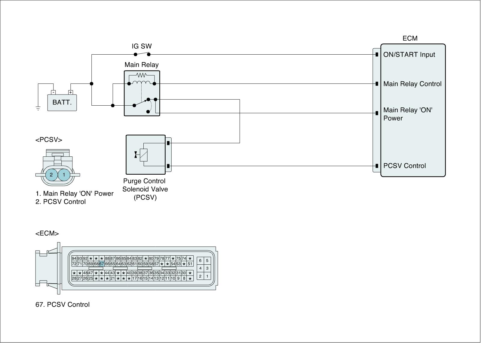 The evaporative emission control system prevents hydrocarbon (HC) vapors from the fuel tank from escaping into the atmosphere where they could form photochemical smog. Gasoline vapors are collected in the charcoal canister. The ECM controls the Purge Control Solenoid Valve (PCSV) to purge any collected vapors from the canister back to the engine for combustion. This valve is actuated by the purge control signal from the ECM and controls fuel vapor flow from the canister to the intake manifold.
