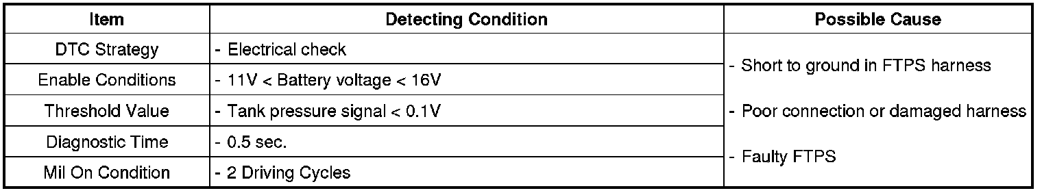 ECM sets DTC P0452 if the ECM detects signal voltage lower than the possible range of a properly operating FTPS.